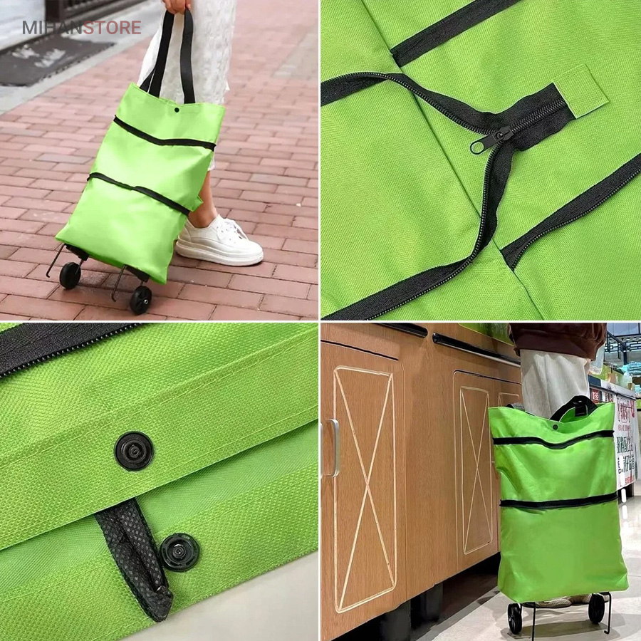 کیف خرید چرخدار تاشو دارای چرخهایی است که به شما کمک میکند بدون اینکه وزن خریدتان را بر روی شانهها یا دستهای خود احساس کنید، خریدتان را بهراحتی حمل کنید. برای استفاده از ساک خرید در حالت چرخدار، کمی تایرها را به سمت عقب کشیده تا از محل خود خارج شوند و در حالت چرخدار از ساک خرید استفاده کنید.